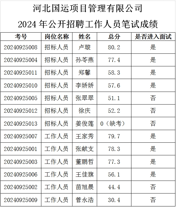 根據(jù)《河北國運項目管理有限公司公開招聘工作人員》招聘公告。于2024年9月25日對符合筆試資格條件的人員進行了筆試,現(xiàn)將筆試成績予以公示。